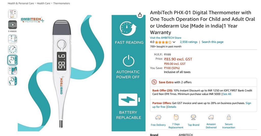 AmbiTech PHX-01 Digital Thermometer with One Touch Operation For Child and Adult Oral or Underarm Use 99/- Only