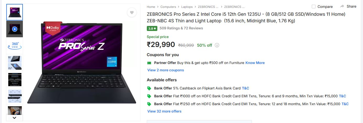 ZEBRONICS Pro Series Z Intel Core i5 12th Gen 1235U – (8 GB/512 GB SSD/Windows 11 Home) ZEB-NBC 4S Thin and Light Laptop (15.6 inch, Midnight Blue, 1.76 Kg) MRP 60,999/- Offer Price 29,990/- https://fktr.in/H1xo022