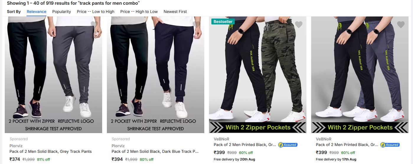 Plorviz Pack of 2 Men Solid Black, Grey Track Pants 374/- only https://www.flipkart.com/search?q=track+pants+for+men+combo&sid=clo%2Cvua%2Cjlk%2C6ql&as=on&as-show=on&otracker=AS_QueryStore_OrganicAutoSuggest_1_20_na_na_ps&otracker1=AS_QueryStore_OrganicAutoSuggest_1_20_na_na_ps&as-pos=1&as-type=RECENT&suggestionId=track+pants+for+men+combo|Men’s+Track+Pants&requestId=a36fdfb6-1764-451a-b4d0-05152cfeb7c3&as-searchtext=track+pants+for+men+&p[]=facets.price_range.from%3D300&p[]=facets.price_range.to%3D400&affid=teamasfho