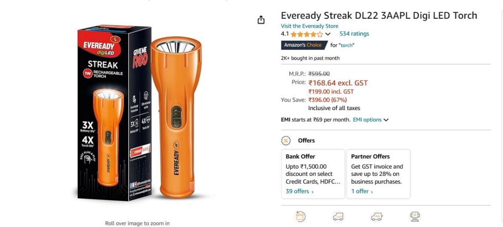 Eveready Streak DL22 3AAPL Digi LED Torch 199/- AmazingLoot 2 years ago Eveready Streak DL22 3AAPL Digi LED Torch 199/- MRP 595/- Offer Price 199/- https://amzn.to/4fEBdwF