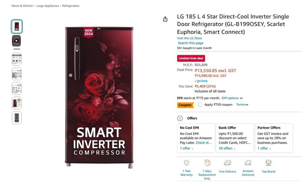 LG 185 L 4 Star Direct-Cool Inverter Single Door Refrigerator (GL-B199OSEY, Scarlet Euphoria, Smart Connect)