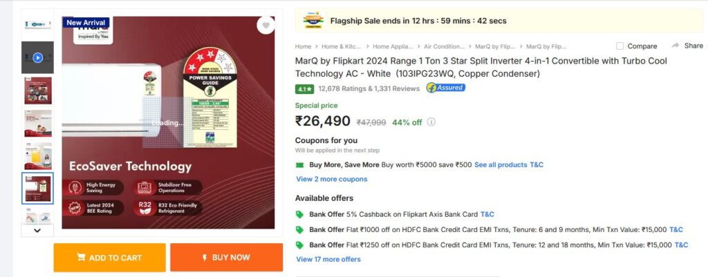 MarQ by Flipkart 2024 Range 1 Ton 3 Star Split Inverter 4-in-1 Convertible with Turbo Cool Technology AC