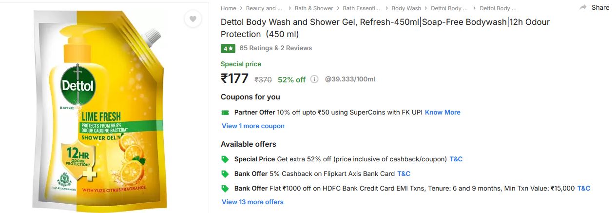 Dettol Body Wash and Shower Gel, Refresh 450ml Soap Free Bodywash 12h Odour Protection(450 ml) @177