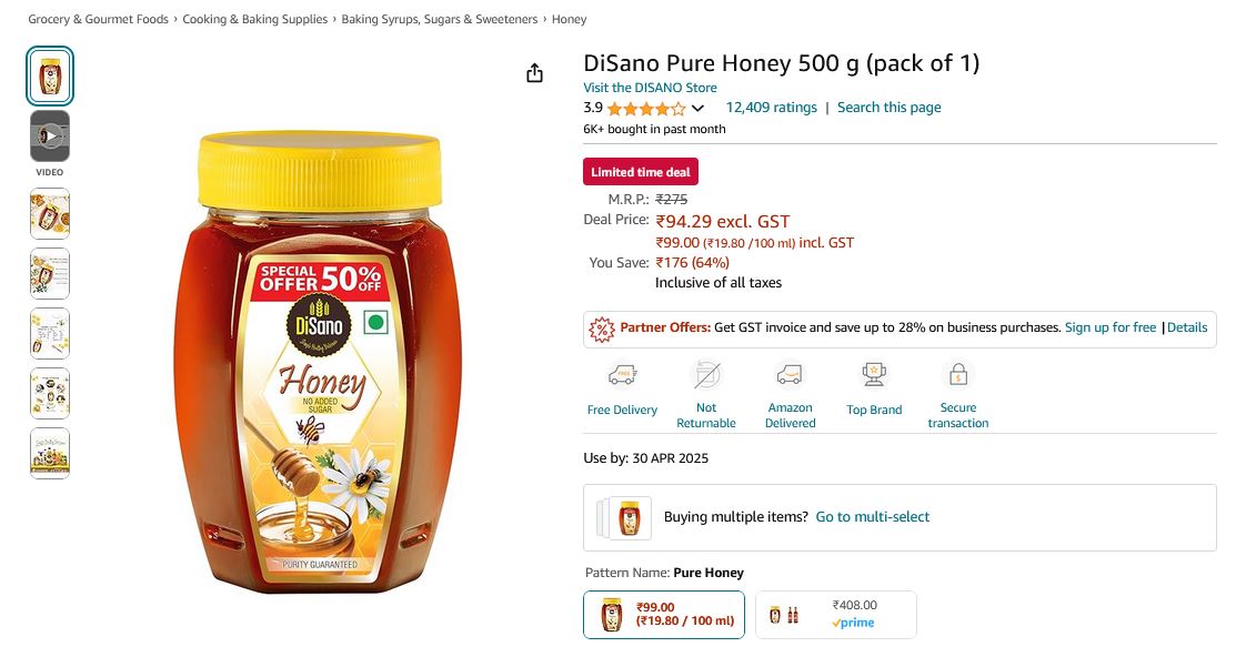DiSano Pure Honey 500 g (pack of 1) Only 99/- https://amzn.to/3X1OkRa